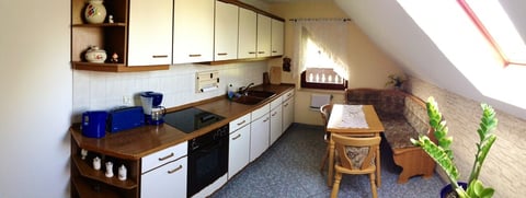In der komplett ausgestatteten Küche mit Herd mit Cerankochfeld, Kühl- und Gefrierkombination, Mikrowelle, Toaster, Kaffeemaschine, Wasserkocher lassen sich Gerichte aller Art zaubern.
